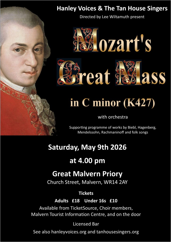 Our Spring Concert is a joint venture with Hanley Voices at Malvern Priory at 4pm on May 9th. The main feature will be Mozart’s C Minor Mass – considered one of his greatest works. Other pieces include works by Biebl, Hagenberg, Mendelssohn, Rachmaninoff and folk songs.